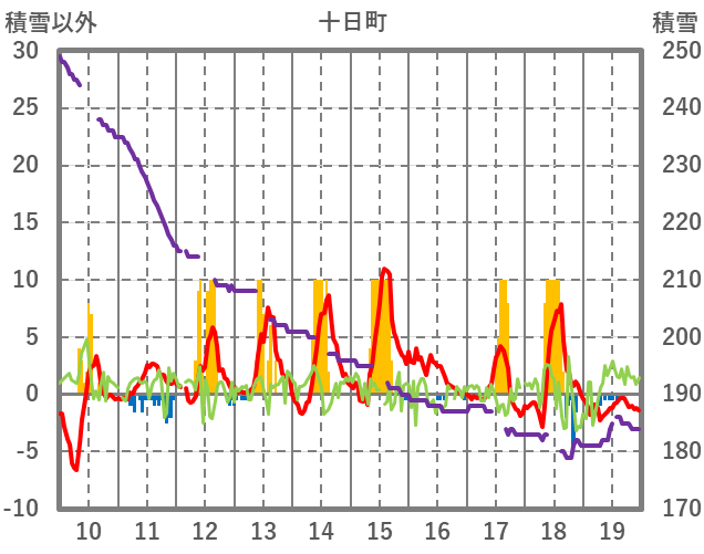 | 日 | 時 | 気温 | 降水 | 風向/風速 | 日照 | 積雪 | 降雪 |