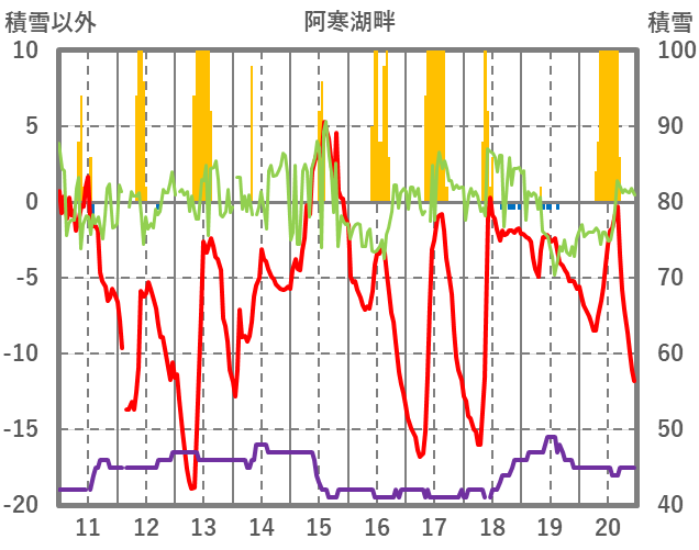 | 日 | 時 | 気温 | 降水 | 風向/風速 | 日照 | 積雪 | 降雪 |