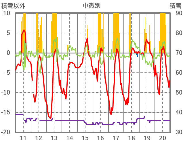 | 日 | 時 | 気温 | 降水 | 風向/風速 | 日照 | 積雪 | 降雪 |