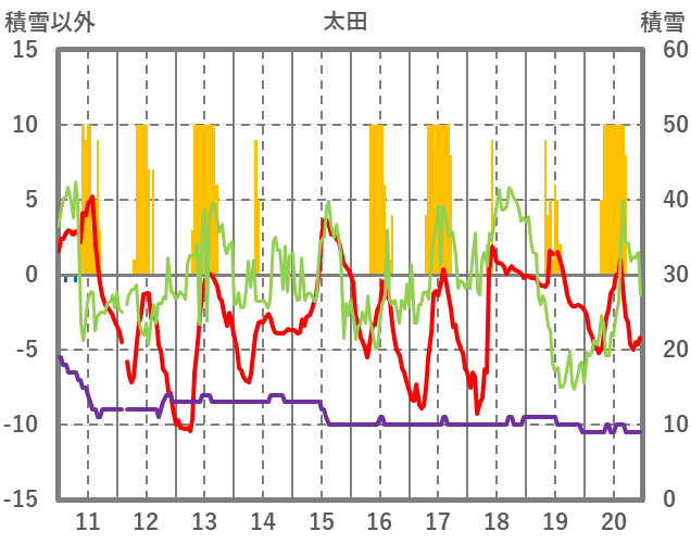 | 日 | 時 | 気温 | 降水 | 風向/風速 | 日照 | 積雪 | 降雪 |