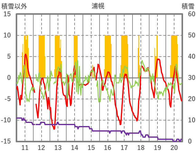| 日 | 時 | 気温 | 降水 | 風向/風速 | 日照 | 積雪 | 降雪 |