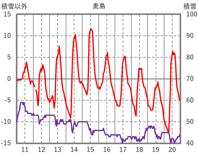 | 日 | 時 | 気温 | 降水 | 風向/風速 | 日照 | 積雪 | 降雪 |