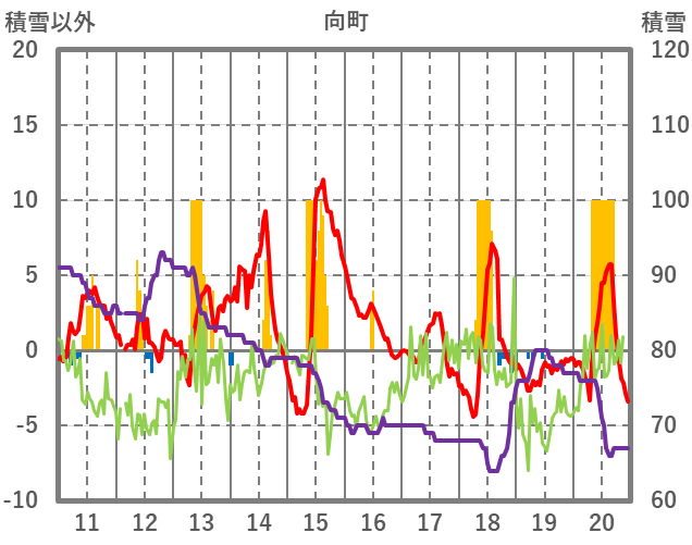 | 日 | 時 | 気温 | 降水 | 風向/風速 | 日照 | 積雪 | 降雪 |