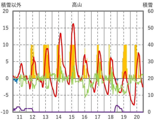 | 日 | 時 | 気温 | 降水 | 風向/風速 | 日照 | 積雪 | 降雪 |