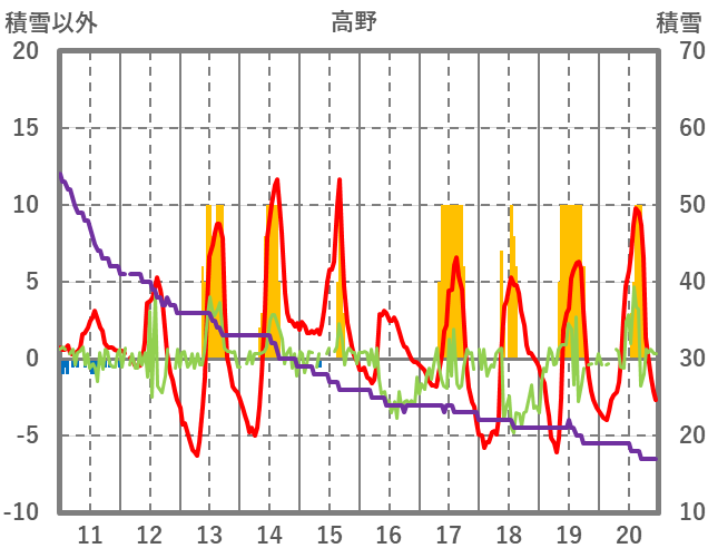 | 日 | 時 | 気温 | 降水 | 風向/風速 | 日照 | 積雪 | 降雪 |