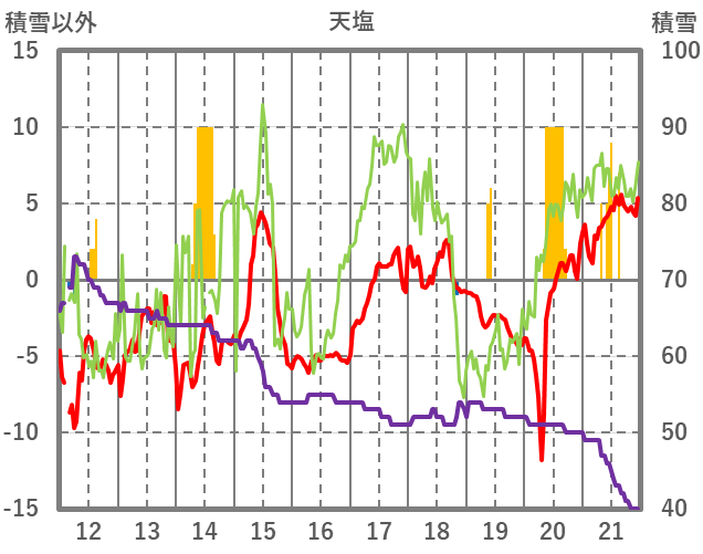 | 日 | 時 | 気温 | 降水 | 風向/風速 | 日照 | 積雪 | 降雪 |