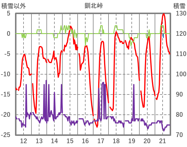 | 日 | 時 | 気温 | 降水 | 風向/風速 | 日照 | 積雪 | 降雪 |