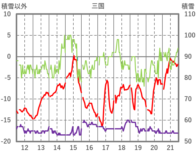 | 日 | 時 | 気温 | 降水 | 風向/風速 | 日照 | 積雪 | 降雪 |