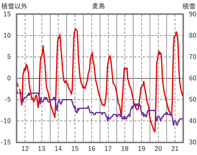 | 日 | 時 | 気温 | 降水 | 風向/風速 | 日照 | 積雪 | 降雪 |