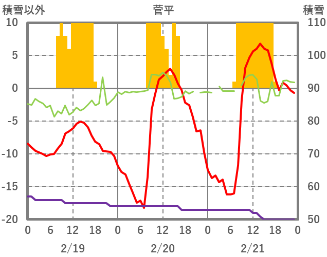 | 日 | 時 | 気温 | 降水 | 風向/風速 | 日照 | 積雪 | 降雪 |