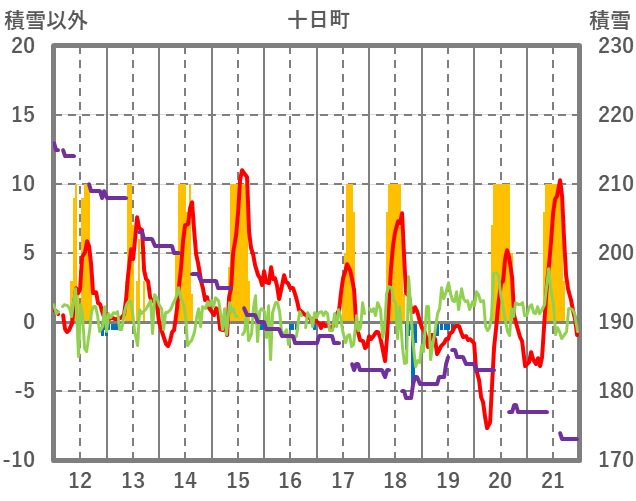 | 日 | 時 | 気温 | 降水 | 風向/風速 | 日照 | 積雪 | 降雪 |