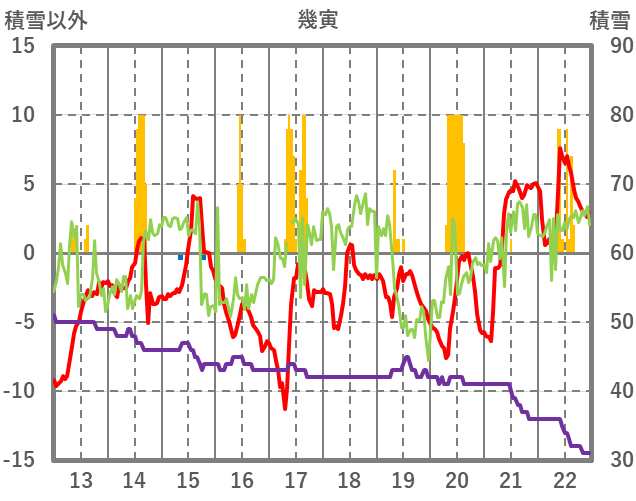 | 日 | 時 | 気温 | 降水 | 風向/風速 | 日照 | 積雪 | 降雪 |