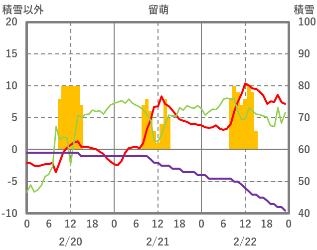| 日 | 時 | 気温 | 降水 | 風向/風速 | 日照 | 積雪 | 降雪 |