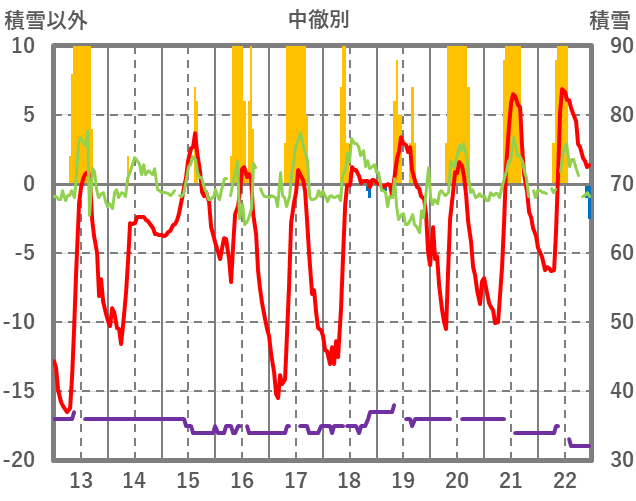 | 日 | 時 | 気温 | 降水 | 風向/風速 | 日照 | 積雪 | 降雪 |