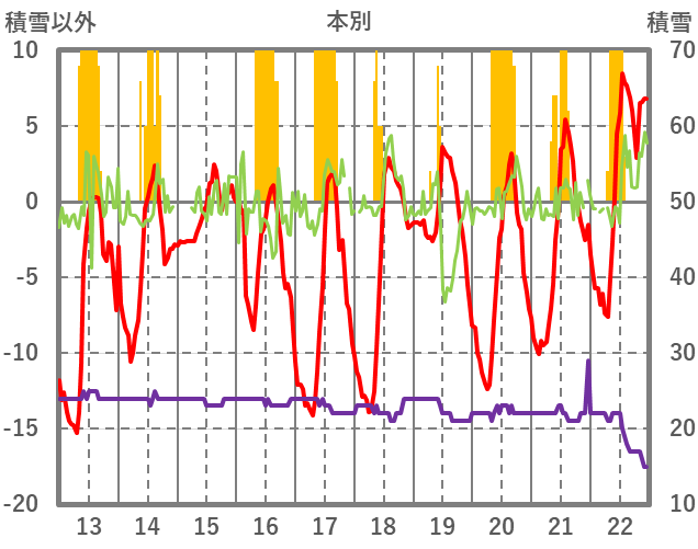 | 日 | 時 | 気温 | 降水 | 風向/風速 | 日照 | 積雪 | 降雪 |