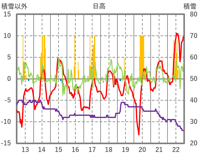 | 日 | 時 | 気温 | 降水 | 風向/風速 | 日照 | 積雪 | 降雪 |