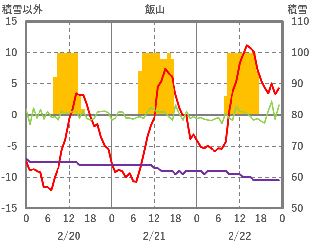 | 日 | 時 | 気温 | 降水 | 風向/風速 | 日照 | 積雪 | 降雪 |