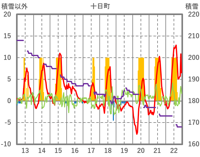 | 日 | 時 | 気温 | 降水 | 風向/風速 | 日照 | 積雪 | 降雪 |