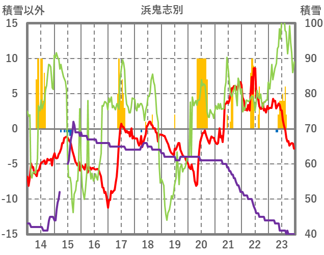 | 日 | 時 | 気温 | 降水 | 風向/風速 | 日照 | 積雪 | 降雪 |