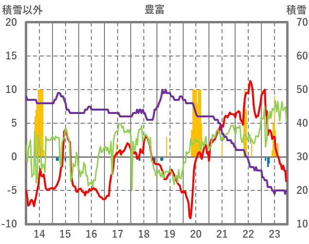 | 日 | 時 | 気温 | 降水 | 風向/風速 | 日照 | 積雪 | 降雪 |