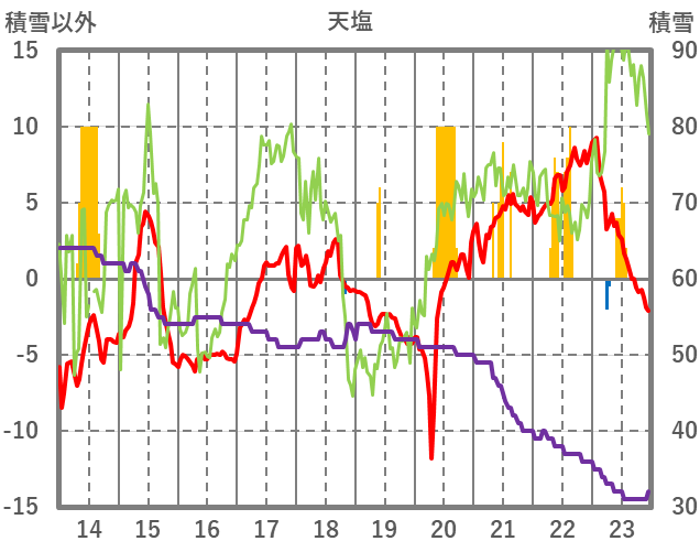 | 日 | 時 | 気温 | 降水 | 風向/風速 | 日照 | 積雪 | 降雪 |