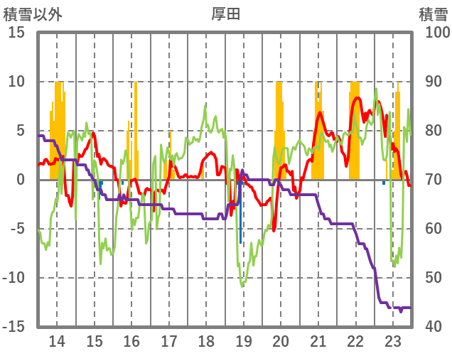 | 日 | 時 | 気温 | 降水 | 風向/風速 | 日照 | 積雪 | 降雪 |