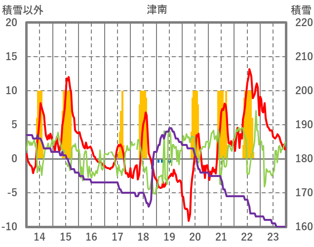 | 日 | 時 | 気温 | 降水 | 風向/風速 | 日照 | 積雪 | 降雪 |