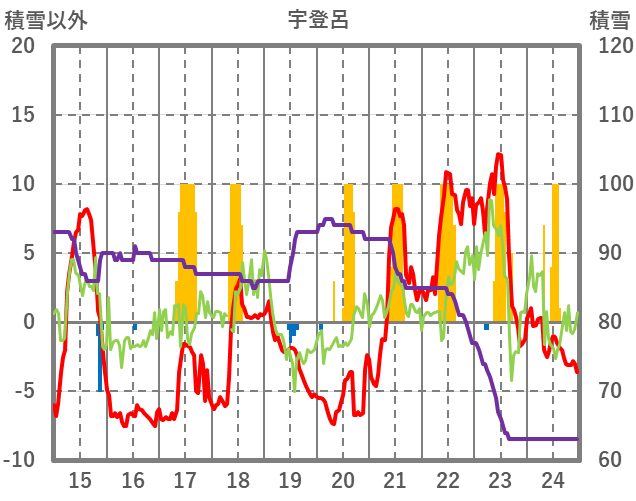 | 日 | 時 | 気温 | 降水 | 風向/風速 | 日照 | 積雪 | 降雪 |