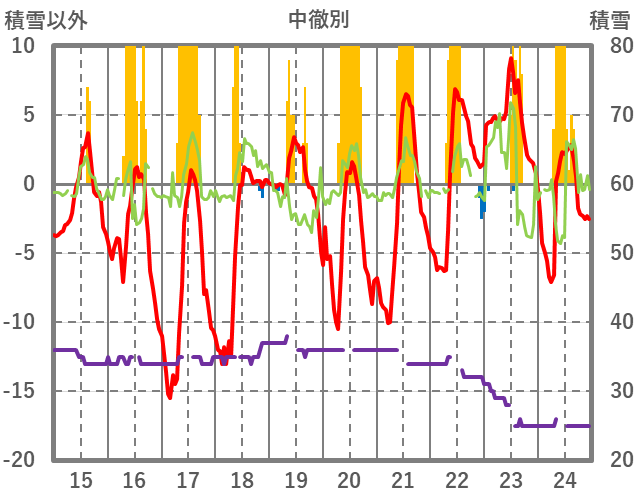 | 日 | 時 | 気温 | 降水 | 風向/風速 | 日照 | 積雪 | 降雪 |