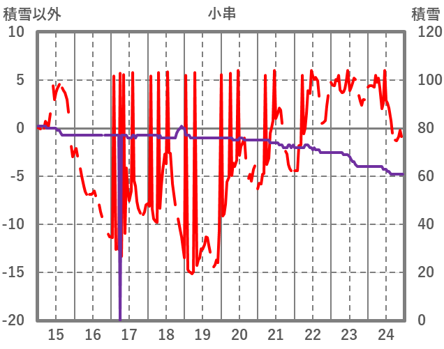 | 日 | 時 | 気温 | 降水 | 風向/風速 | 日照 | 積雪 | 降雪 |