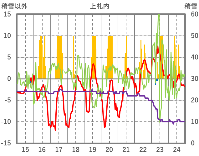 | 日 | 時 | 気温 | 降水 | 風向/風速 | 日照 | 積雪 | 降雪 |