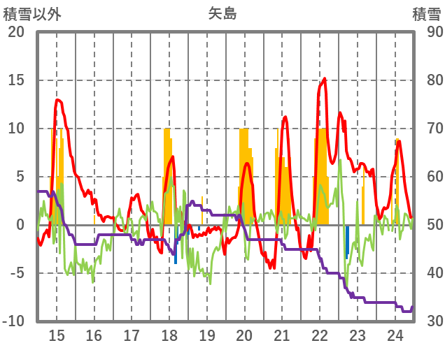 | 日 | 時 | 気温 | 降水 | 風向/風速 | 日照 | 積雪 | 降雪 |