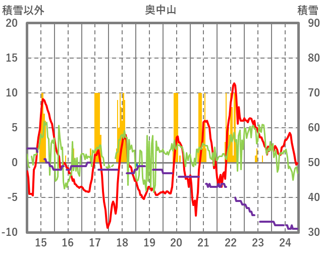 | 日 | 時 | 気温 | 降水 | 風向/風速 | 日照 | 積雪 | 降雪 |