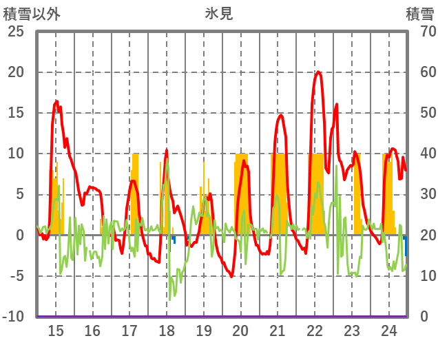 | 日 | 時 | 気温 | 降水 | 風向/風速 | 日照 | 積雪 | 降雪 |