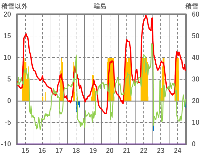 | 日 | 時 | 気温 | 降水 | 風向/風速 | 日照 | 積雪 | 降雪 |