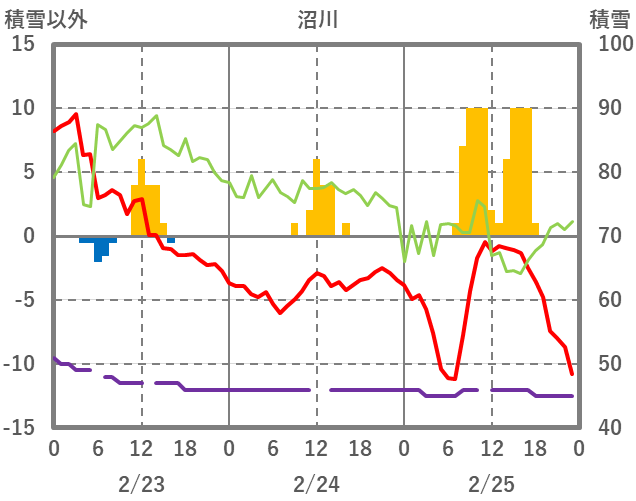 | 日 | 時 | 気温 | 降水 | 風向/風速 | 日照 | 積雪 | 降雪 |
