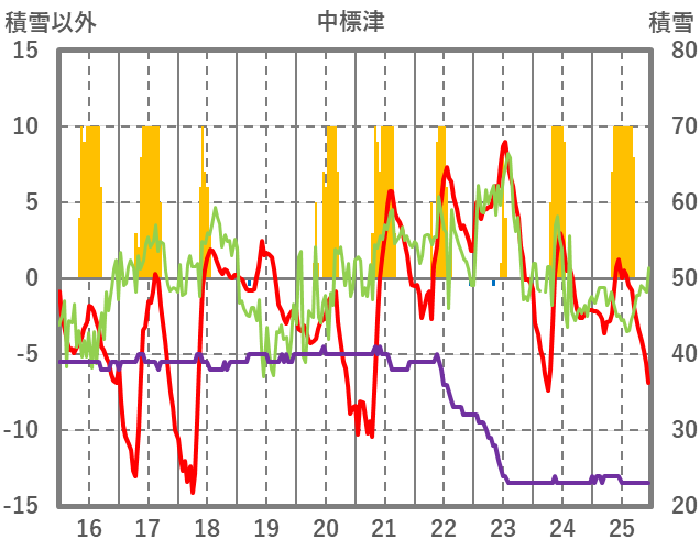 | 日 | 時 | 気温 | 降水 | 風向/風速 | 日照 | 積雪 | 降雪 |