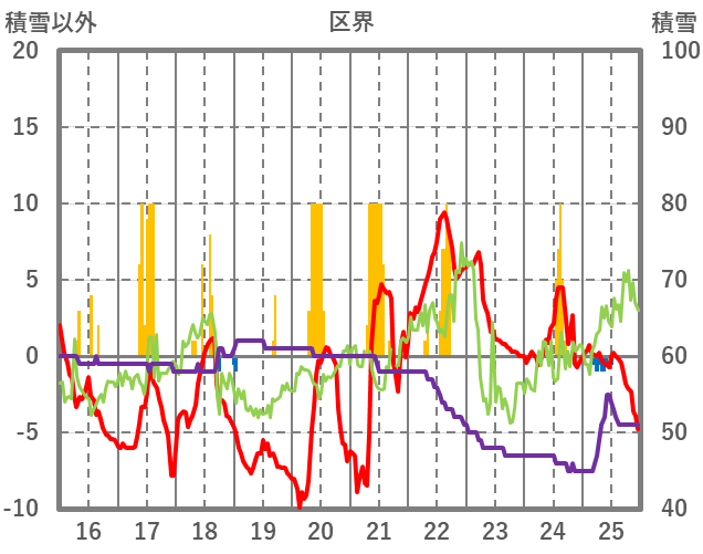 | 日 | 時 | 気温 | 降水 | 風向/風速 | 日照 | 積雪 | 降雪 |
