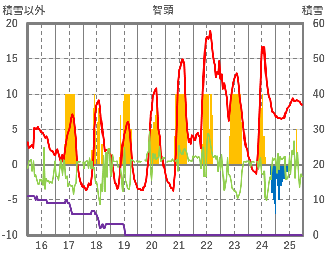 | 日 | 時 | 気温 | 降水 | 風向/風速 | 日照 | 積雪 | 降雪 |