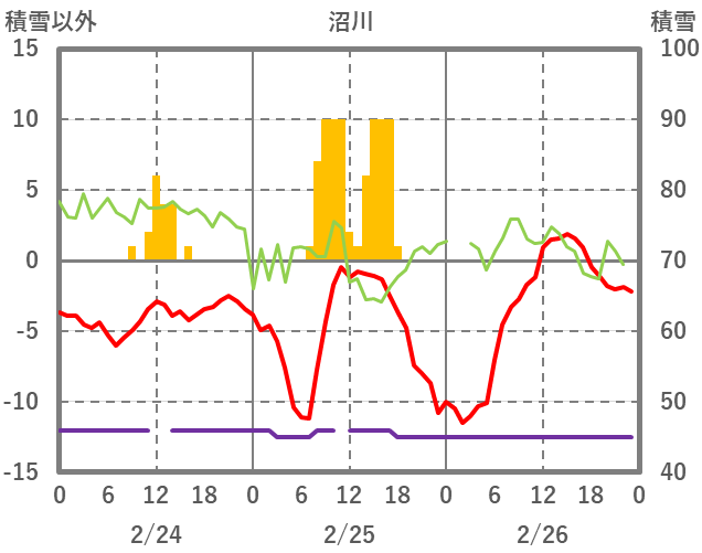 | 日 | 時 | 気温 | 降水 | 風向/風速 | 日照 | 積雪 | 降雪 |