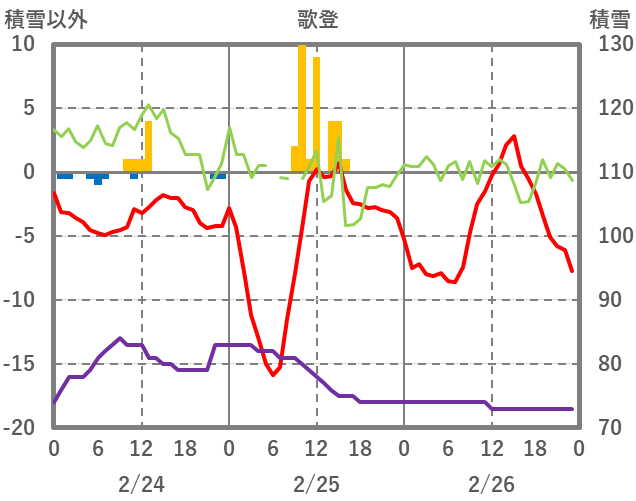 | 日 | 時 | 気温 | 降水 | 風向/風速 | 日照 | 積雪 | 降雪 |
