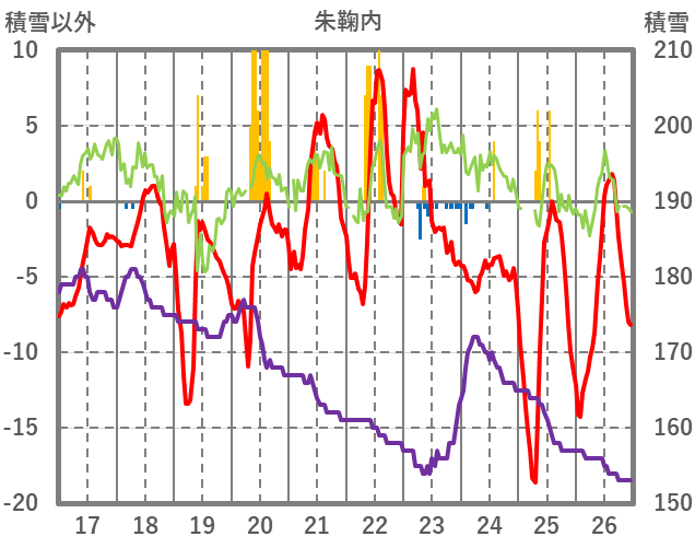 | 日 | 時 | 気温 | 降水 | 風向/風速 | 日照 | 積雪 | 降雪 |