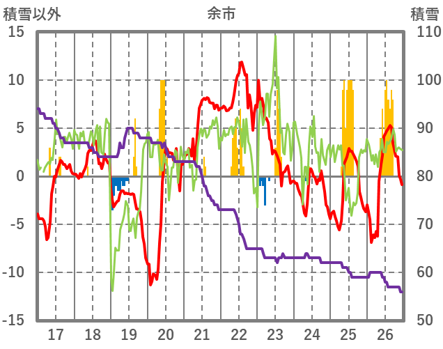 | 日 | 時 | 気温 | 降水 | 風向/風速 | 日照 | 積雪 | 降雪 |
