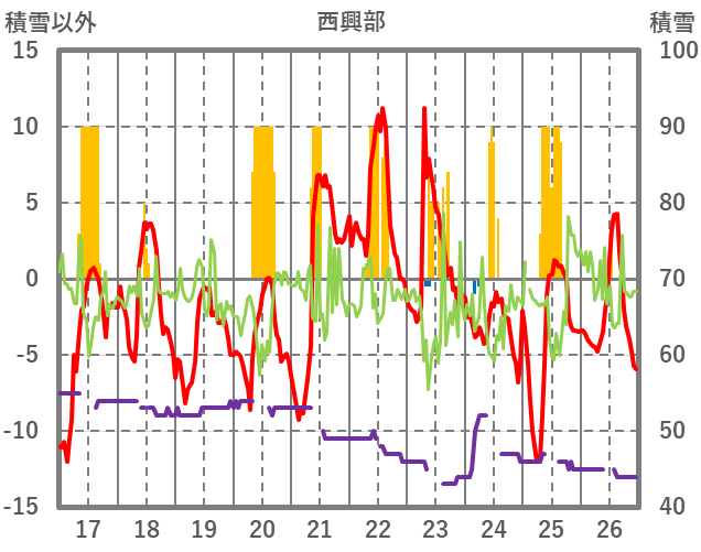 | 日 | 時 | 気温 | 降水 | 風向/風速 | 日照 | 積雪 | 降雪 |