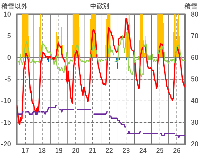 | 日 | 時 | 気温 | 降水 | 風向/風速 | 日照 | 積雪 | 降雪 |