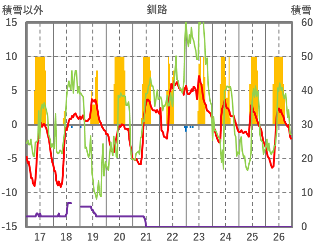 | 日 | 時 | 気温 | 降水 | 風向/風速 | 日照 | 積雪 | 降雪 |