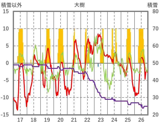 | 日 | 時 | 気温 | 降水 | 風向/風速 | 日照 | 積雪 | 降雪 |