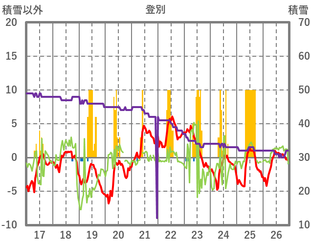 | 日 | 時 | 気温 | 降水 | 風向/風速 | 日照 | 積雪 | 降雪 |