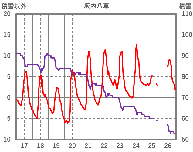 | 日 | 時 | 気温 | 降水 | 風向/風速 | 日照 | 積雪 | 降雪 |