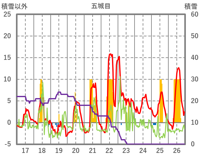 | 日 | 時 | 気温 | 降水 | 風向/風速 | 日照 | 積雪 | 降雪 |